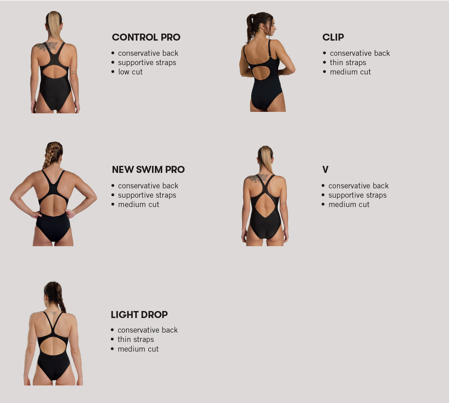 Wide straps and increased back coverage.
